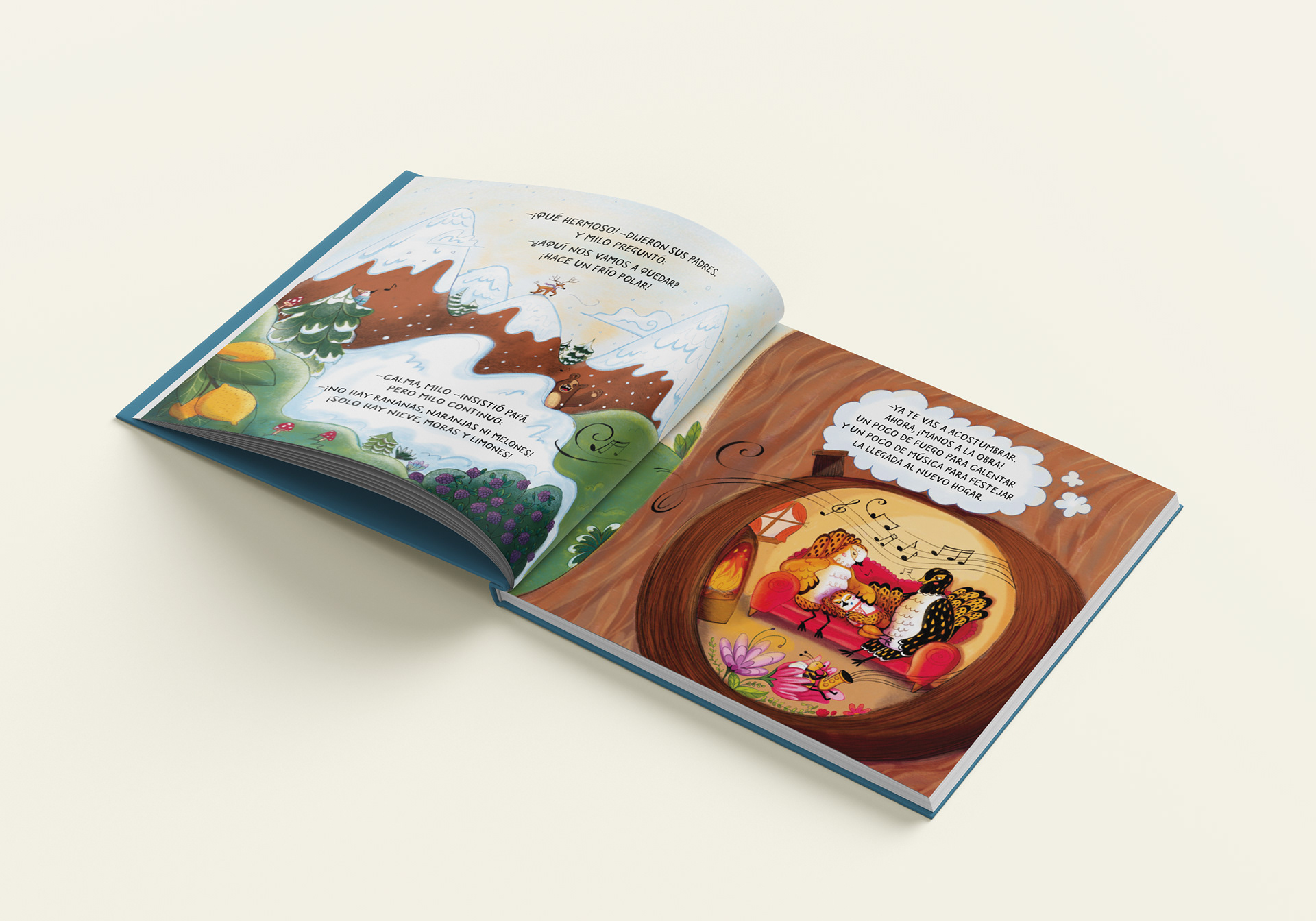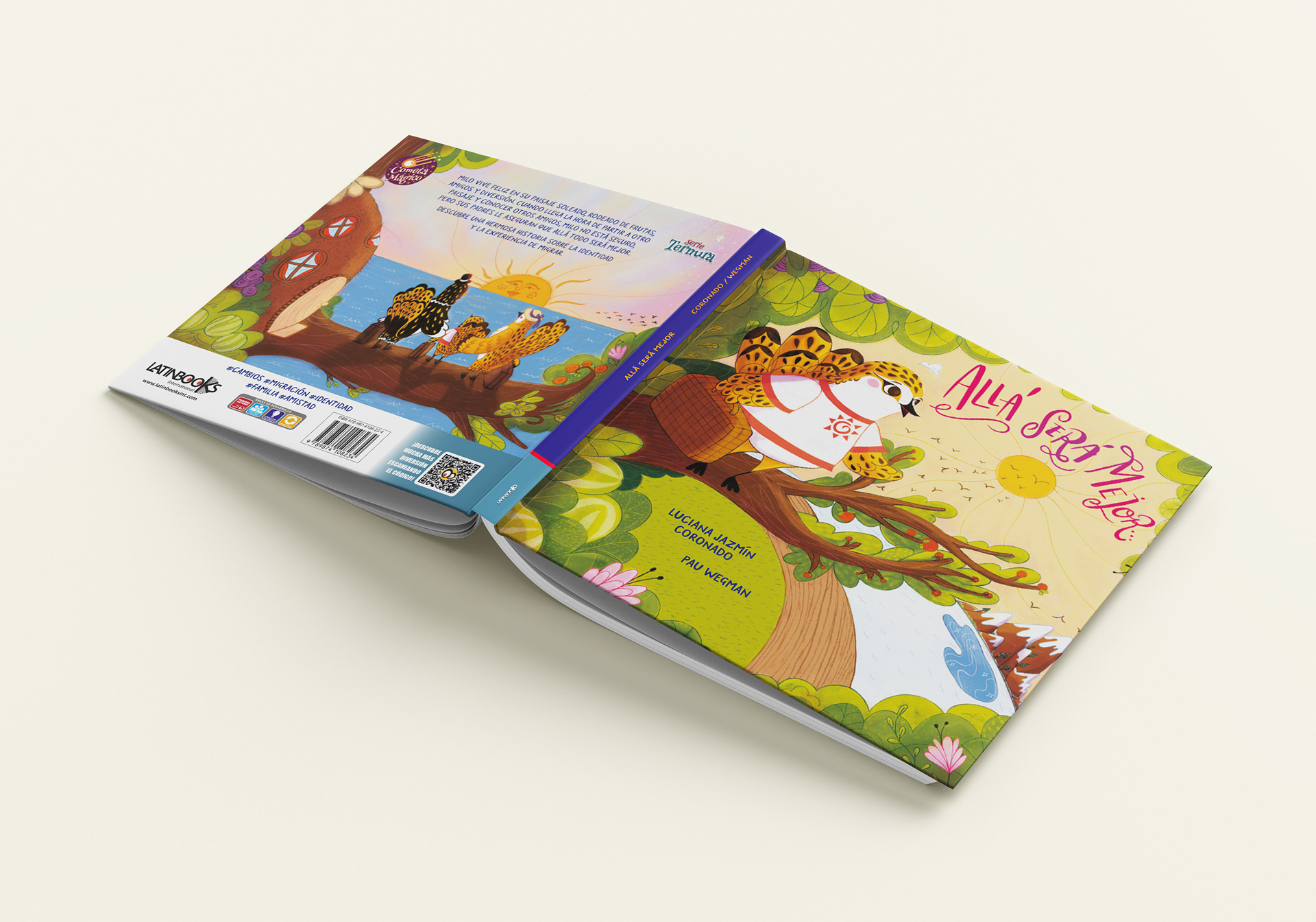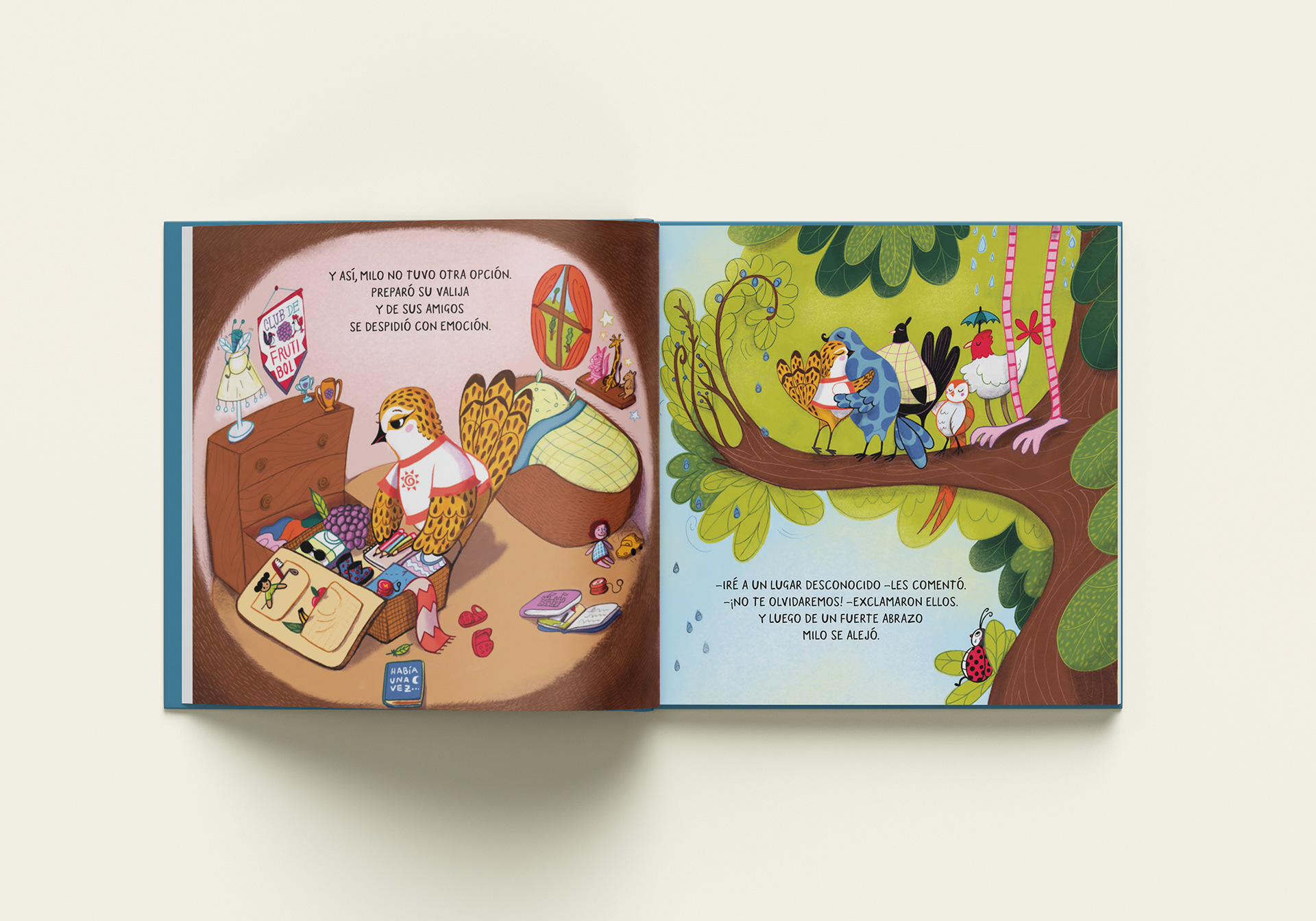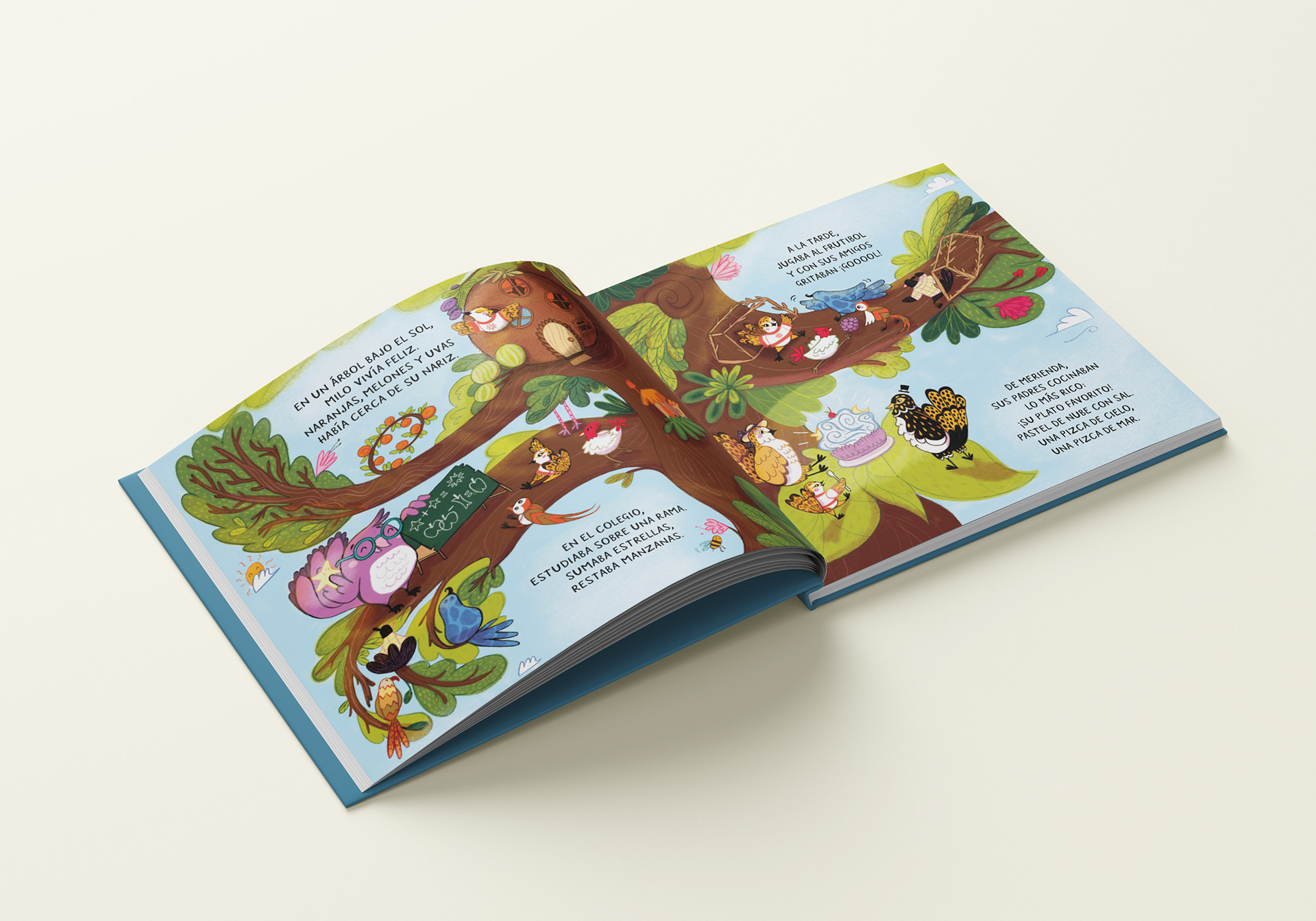 Libro-álbum para Latinbooks sobre un pajarito que se llama Milo que debe mudarse con sus padres, cambiar de árbol, de paisajes y de escuela. Dibujado en lápiz a mano y coloreado digitalmente con Procreate. Escrito por Luciana Jazmín Coronado.