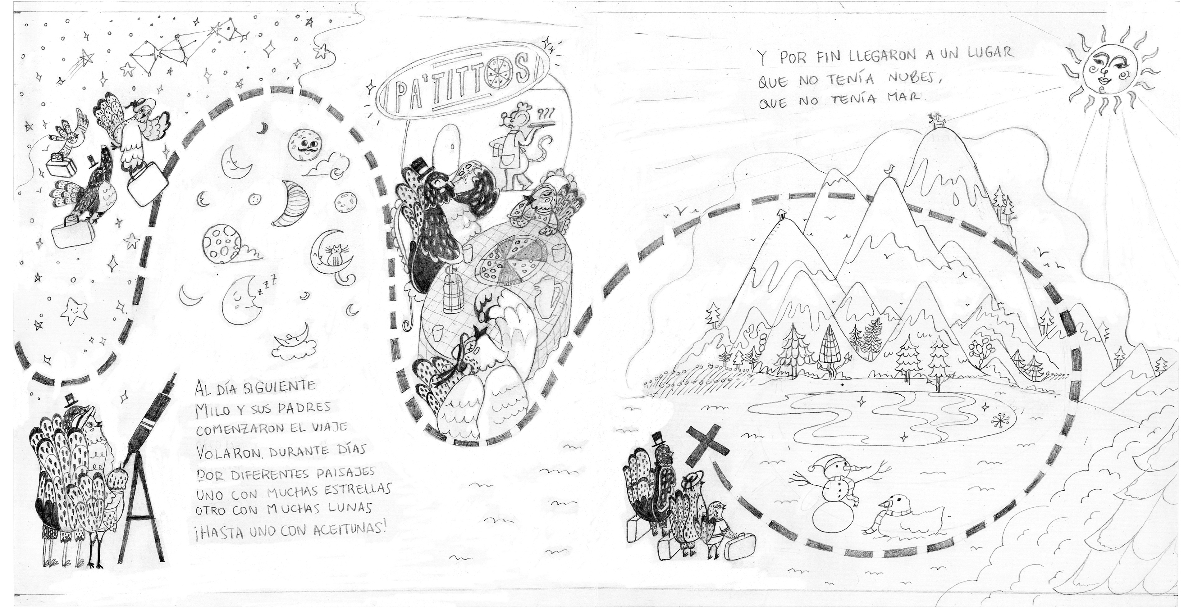 A picture book for Latinbooks about a little bird named Milo who has to move with his parents, changing trees, scenery, and schools. Hand-drawn in pencil and digitally colored using Procreate. Writen by Luciana Jazmín Coronado.